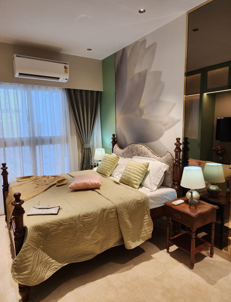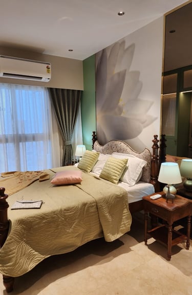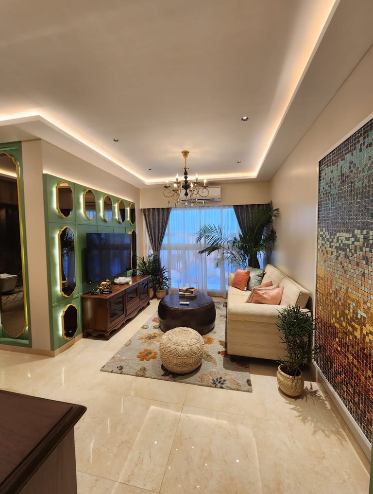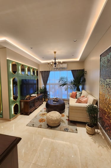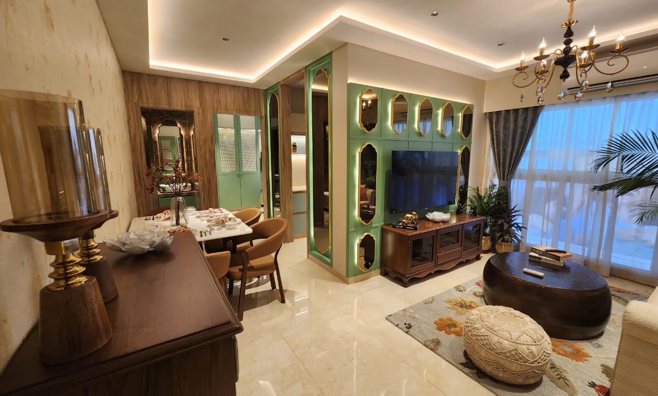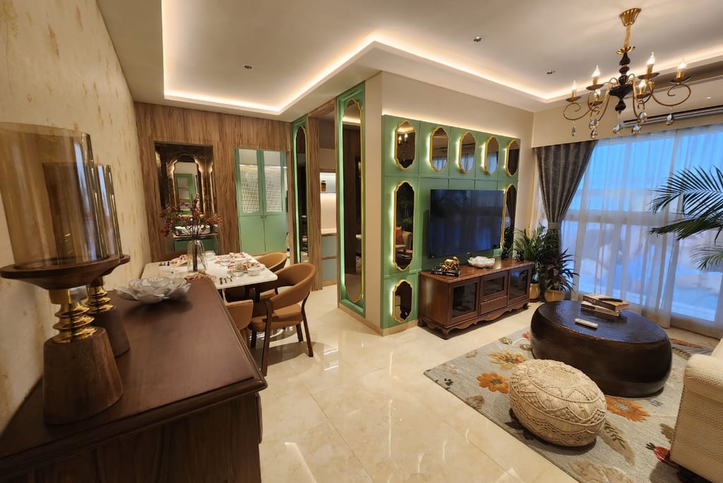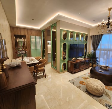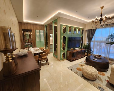 This thoughtfully designed living–dining space blends warm woods, soft neutrals, and elegant accents to create a refined yet inviting atmosphere. Subtle lighting, curated décor, and a feature wall with geometric mirrors elevate the space with a sense of modern luxury.