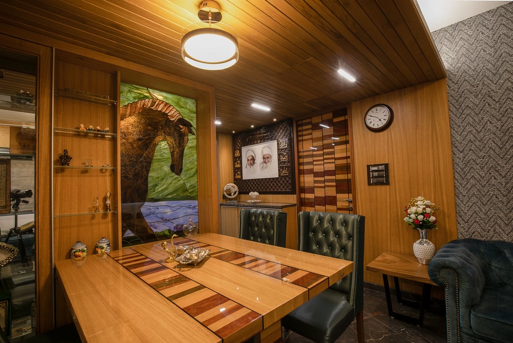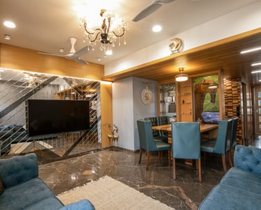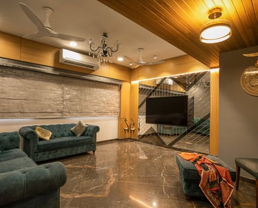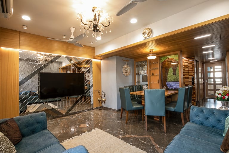 This luxurious living–dining space blends rich materials with striking visual details, featuring polished marble flooring, tailored upholstery, and a dramatic mirrored TV wall. Warm wood tones, artistic wall elements, and elegant lighting create a refined yet welcoming ambiance.