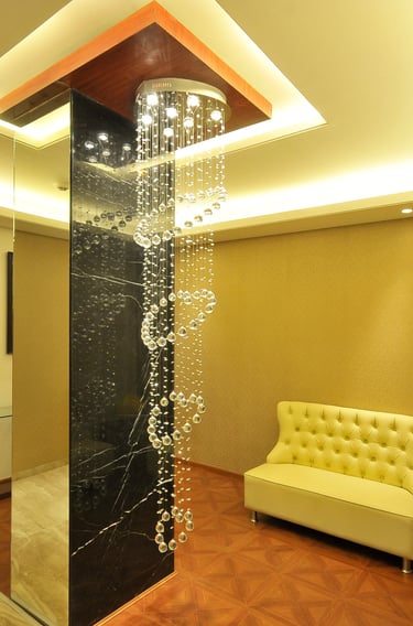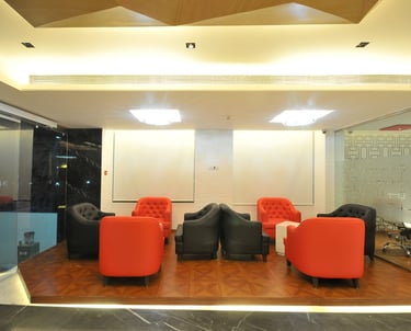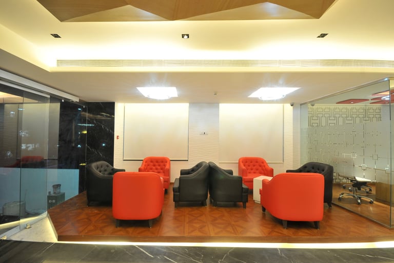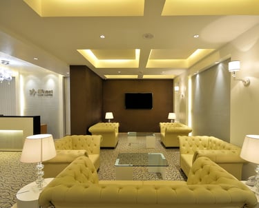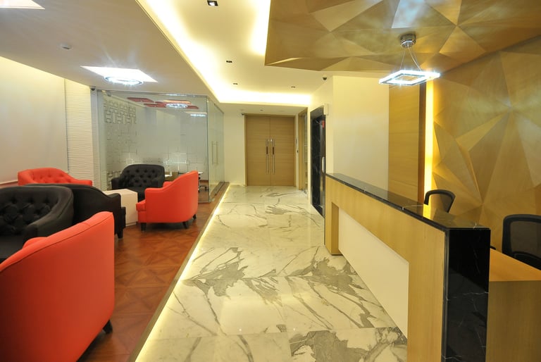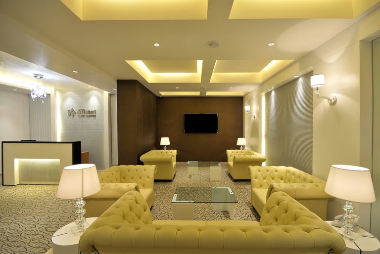 Reception Lounge: Luxurious tufted seating, layered ceiling lighting, and minimalist décor form an elegant welcome space for clients and guests.