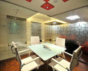 Conference Room: A striking high-gloss executive table, acoustic wall paneling, and ergonomic seating set the stage for focused meetings and high-level discussions.